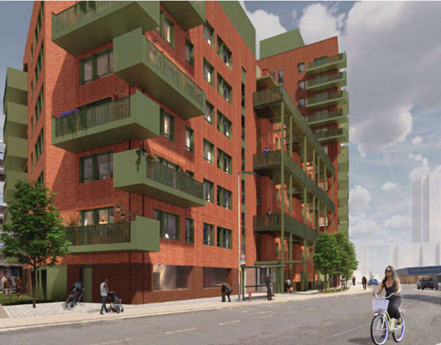 Old Kent Rd Action Plan, sub area 4, sites under construction. Image: Southwark Council. CGI of building G1 of Tustin Estate Redevelopment. Image: Southwark council planning application.
